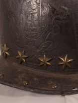 腰巻に六陵の星が打たれています。このような兜鉢に錣を備えつけたものを、俗に南蛮兜と称しました。